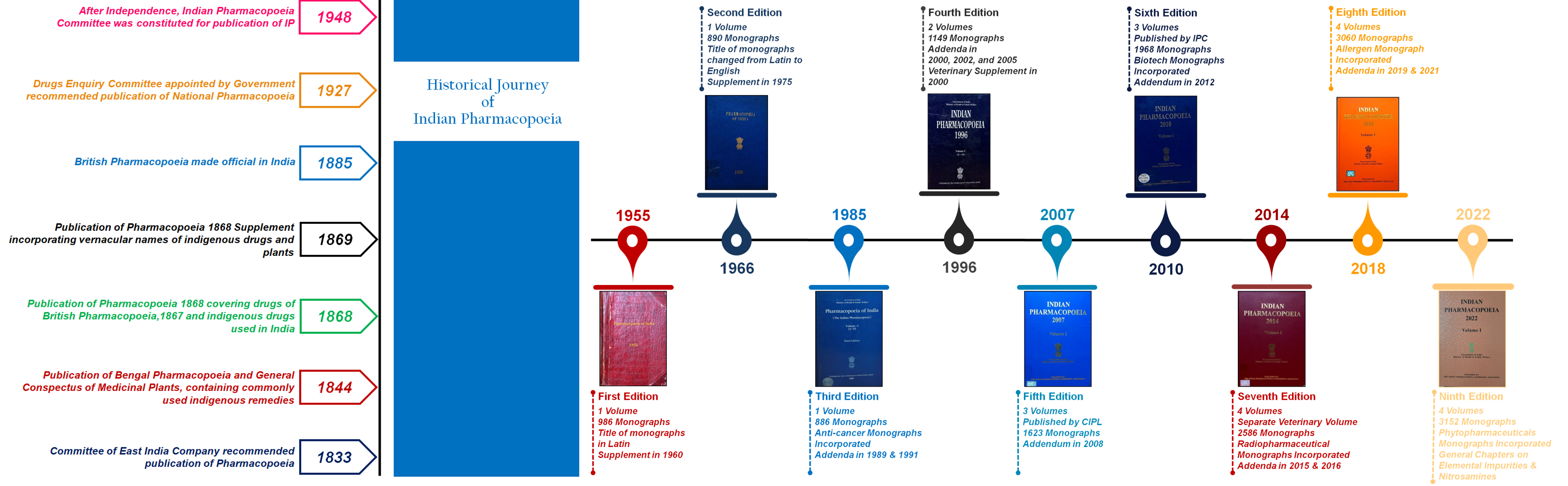 In 2005, MoHFW established the IPC as an autonomous Institute to publish the IP at regular intervals and to develop reference standards. Thereafter, IPC first published the IP Addendum 2005 which featured many monographs on anti-retroviral pharmaceuticals and herbal plants commonly used in traditional Indian medicines which were not covered by other pharmacopoeias. Thereafter, in 2007 IPC published the fifth edition of the IP encompassing 271 new drug monographs focused on pharmaceuticals recommended in National Health Programmes (NHPs) and the National List of Essential Medicines (NLEM). This was followed by the publication of the IP Addendum 2008. The sixth edition of IP was published in 2010 and its Addendum in 2012 featuring monographs on therapeutic categories such as antiretroviral, anticancer, antituberculosis, herbal drugs, human vaccines, and biotechnology-derived drugs. The seventh edition of IP was published in 2014 and its Addenda in 2015 and 2016. The eighth edition of the IP was published in 2018 and was supplemented by subsequent publications of the IP Addenda 2019 and 2021. The currently official ninth edition of the IP was published in 2022 so as to become effective from 1st December, 2022. Concise historical overview of the publication of IP editions is given below.
